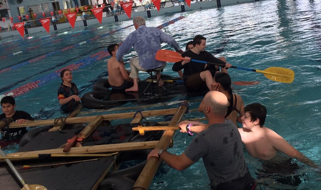Students from Bidgee School build rafts and float Wagga Wagga’s mayor across the Oasis pool.